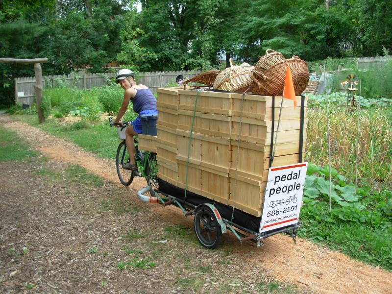 Ruthy bringing crates to the farmers market.