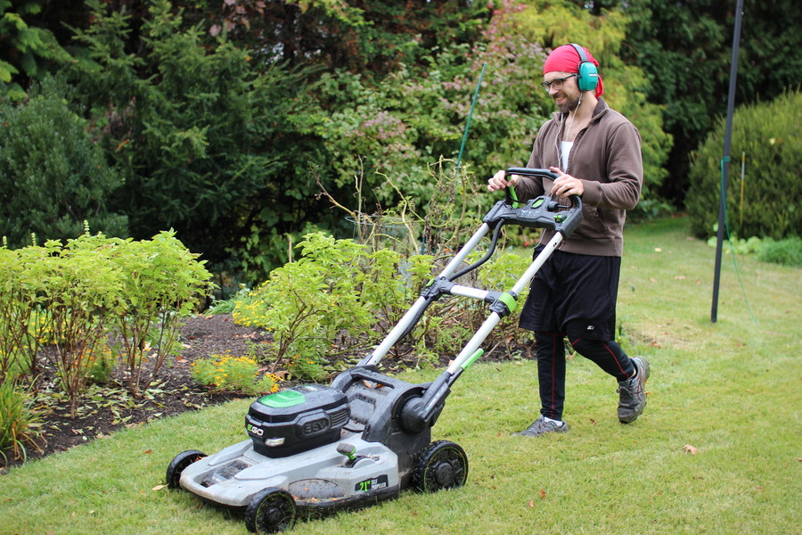 Kyle mowing with an electric mower