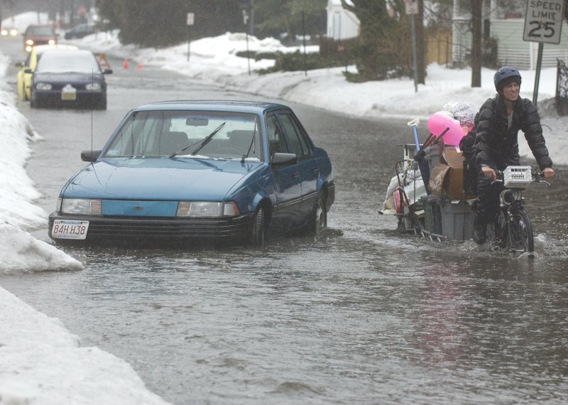 Jackie pedals through the flood
