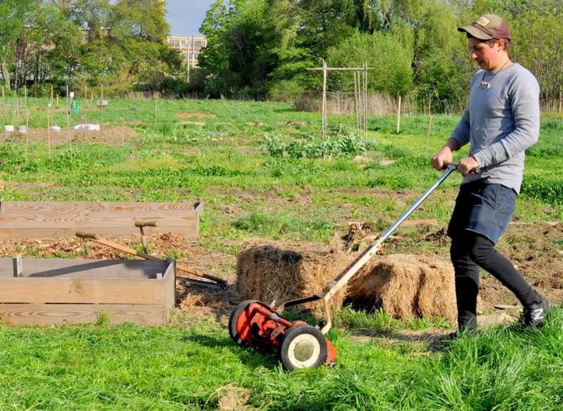 Joel Ruffner mowing at the community gardens